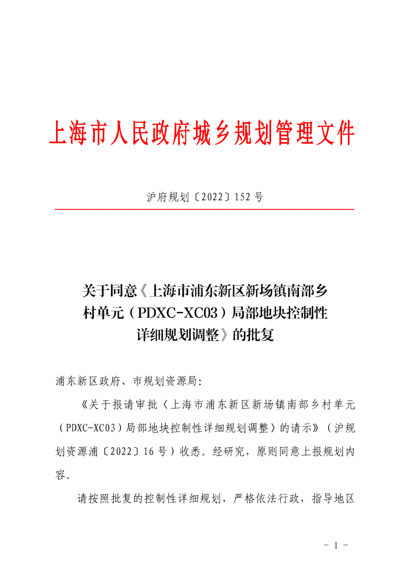 《关于报请审批〈上海市浦东新区新场镇南部乡村单元(PDXC-XC03)局部地块控制性详细规划调整〉的请示》(沪规划资源浦〔2022〕16号)收悉。经研究,原则同意上报规划内容。