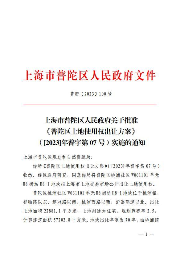 你局《普陀区土地使用权出让方案》([2023]年普字第07号)收悉。经区政府研究,同意你局将普陀区桃浦社区W061101单元H8街坊H8-1地块报上海市土地交易市场公开出让土地使用权。