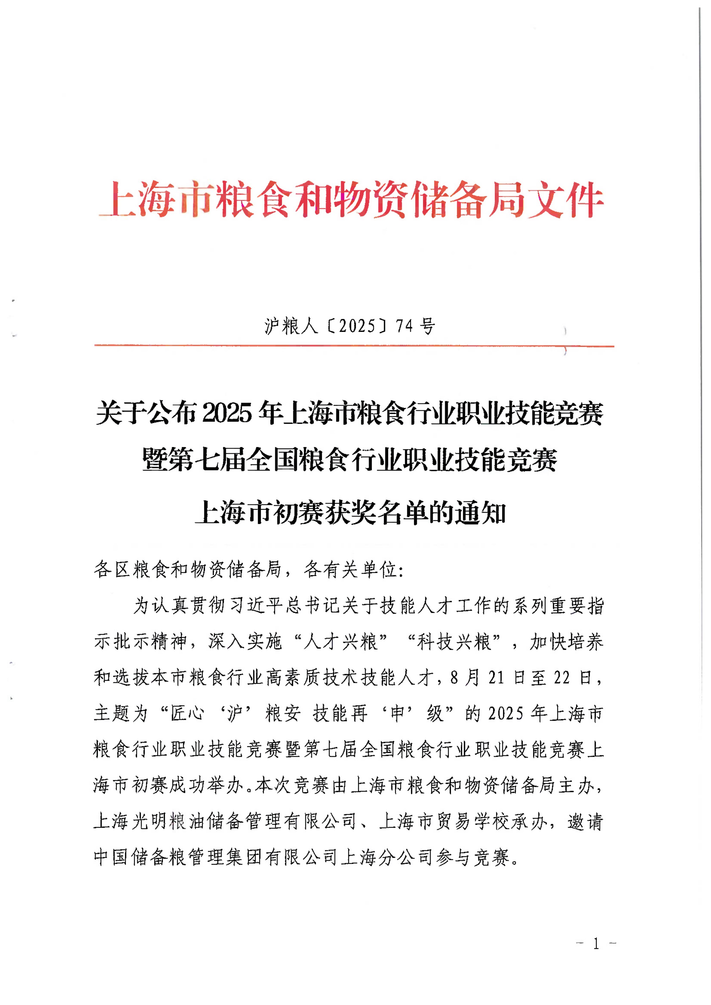2025年上海市粮食行业职业技能竞赛暨第七届全国粮食行业职业技能竞赛上海市初赛获奖名单名单