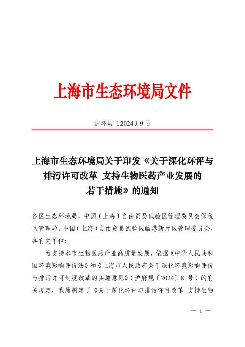 为支持本市生物医药产业高质量发展,依据《中华人民共和国环境影响评价法》和《上海市人民政府关于深化环境影响评价与排污许可制度改革的实施意见》(沪府规〔2024〕8号)的有关规定,我局制定了《关于深化环评与排污许可改革 支持生物医药产业发展的若干措施》,现印发给你们,请认真按照执行。