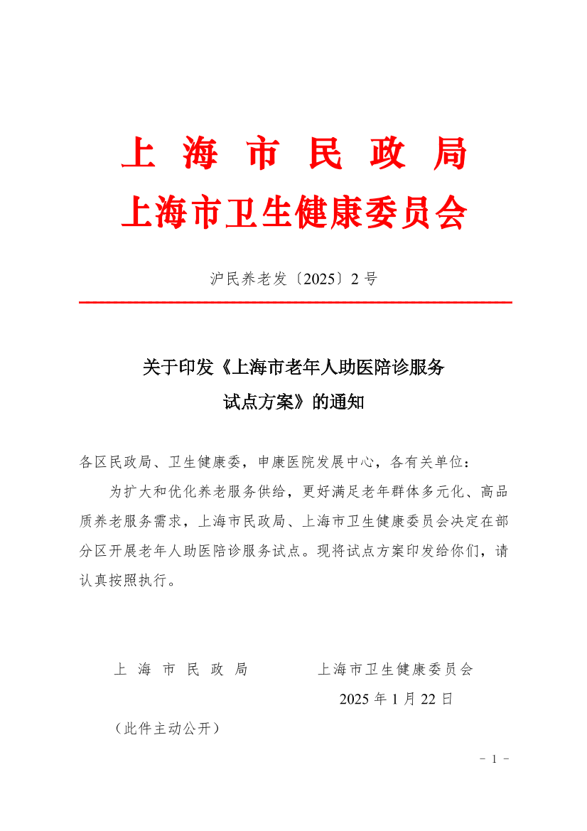 为扩大和优化养老服务供给,更好满足老年群体多元化、高品质养老服务需求,上海市民政局、上海市卫生健康委员会决定在部分区开展老年人助医陪诊服务试点。现将试点方案印发给你们,请认真按照执行。