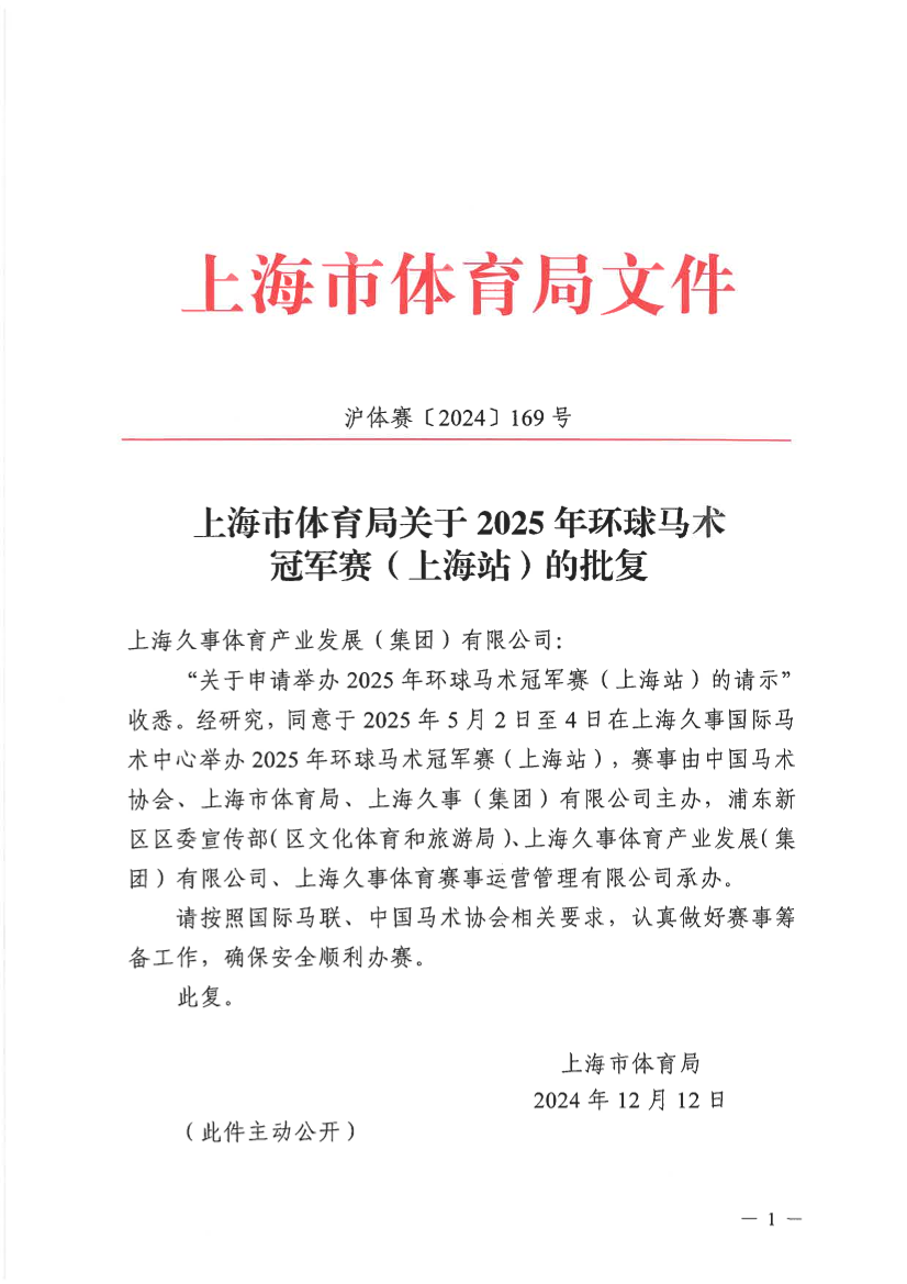 “关于申请举办2025年环球马术冠军赛(上海站)的请示”收悉。经研究,同意于2025年5月2日至4日在上海久事国际马术中心举办2025年环球马术冠军赛(上海站),赛事由中国马术协会、上海市体育局、上海久事(集团)有限公司主办,浦东新区区委宣传部(区文化体育和旅游局)、上海久事体育产业发展(集团)有限公司、上海久事体育赛事运营管理有限公司承办。