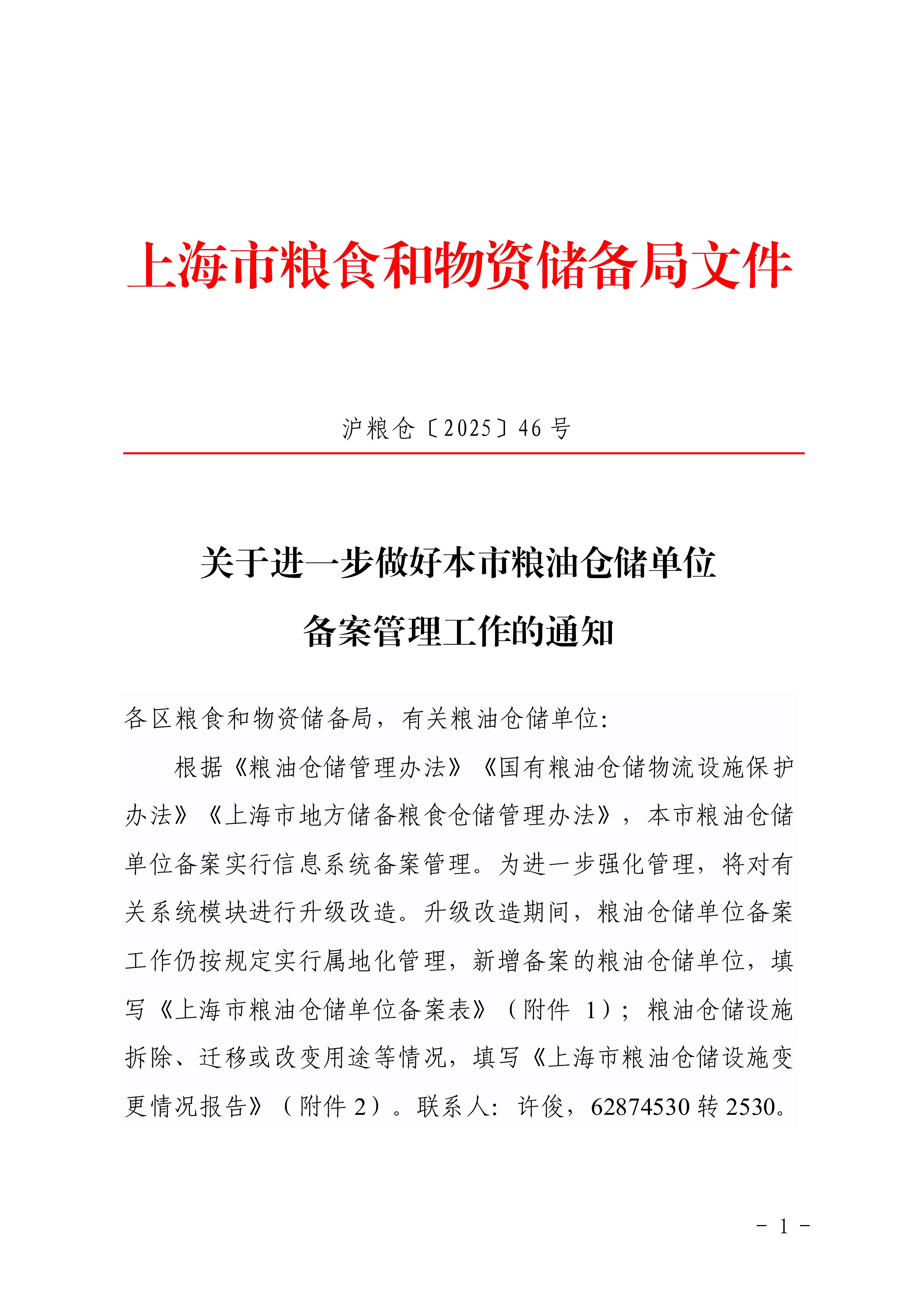 根据《粮油仓储管理办法》《国有粮油仓储物流设施保护办法》《上海市地方储备粮食仓储管理办法》,本市粮油仓储单位备案实行信息系统备案管理。为进一步强化管理,将对有关系统模块进行升级改造。升级改造期间,粮油仓储单位备案工作仍按规定实行属地化管理,新增备案的粮油仓储单位,填写《上海市粮油仓储单位备案表》(附件1);粮油仓储设施拆除、迁移或改变用途等情况,填写《上海市粮油仓储设施变更情况报告》(附件2)。联系人:许俊,62874530转2530。