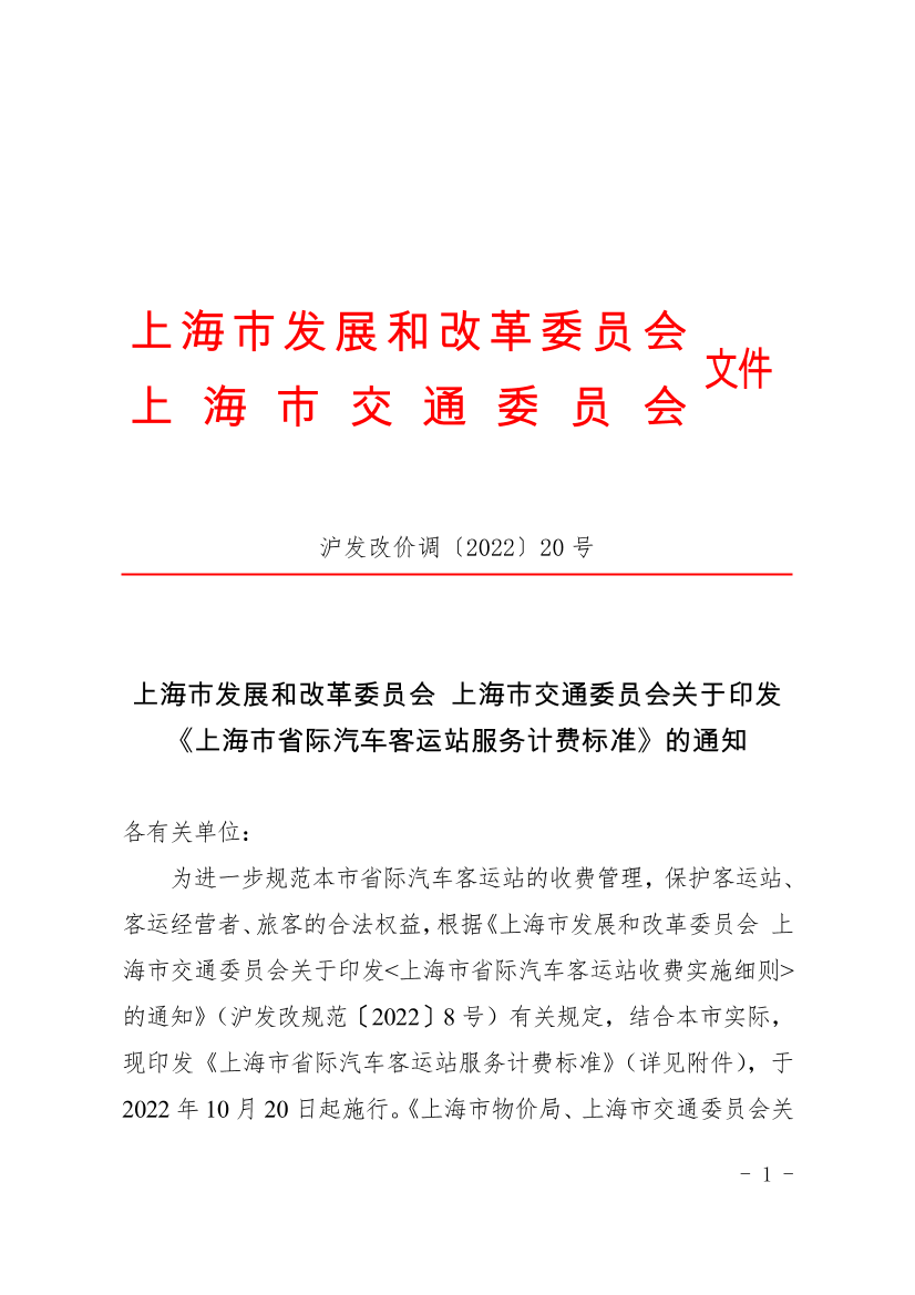 为进一步规范本市省际汽车客运站的收费管理,保护客运站、客运经营者、旅客的合法权益,根据《上海市发展和改革委员会 上海市交通委员会关于印发<上海市省际汽车客运站收费实施细则>的通知》(沪发改规范〔2022〕8号)有关规定,结合本市实际,现印发《上海市省际汽车客运站服务计费标准》(详见附件),于2022年10月20日起施行。《上海市物价局、上海市交通委员会关于印发<上海市省际汽车客运站服务计费标准>的通知》(沪价管〔2017〕25号)同时废止。请有关单位认真执行,并落实好明码标价工作。
