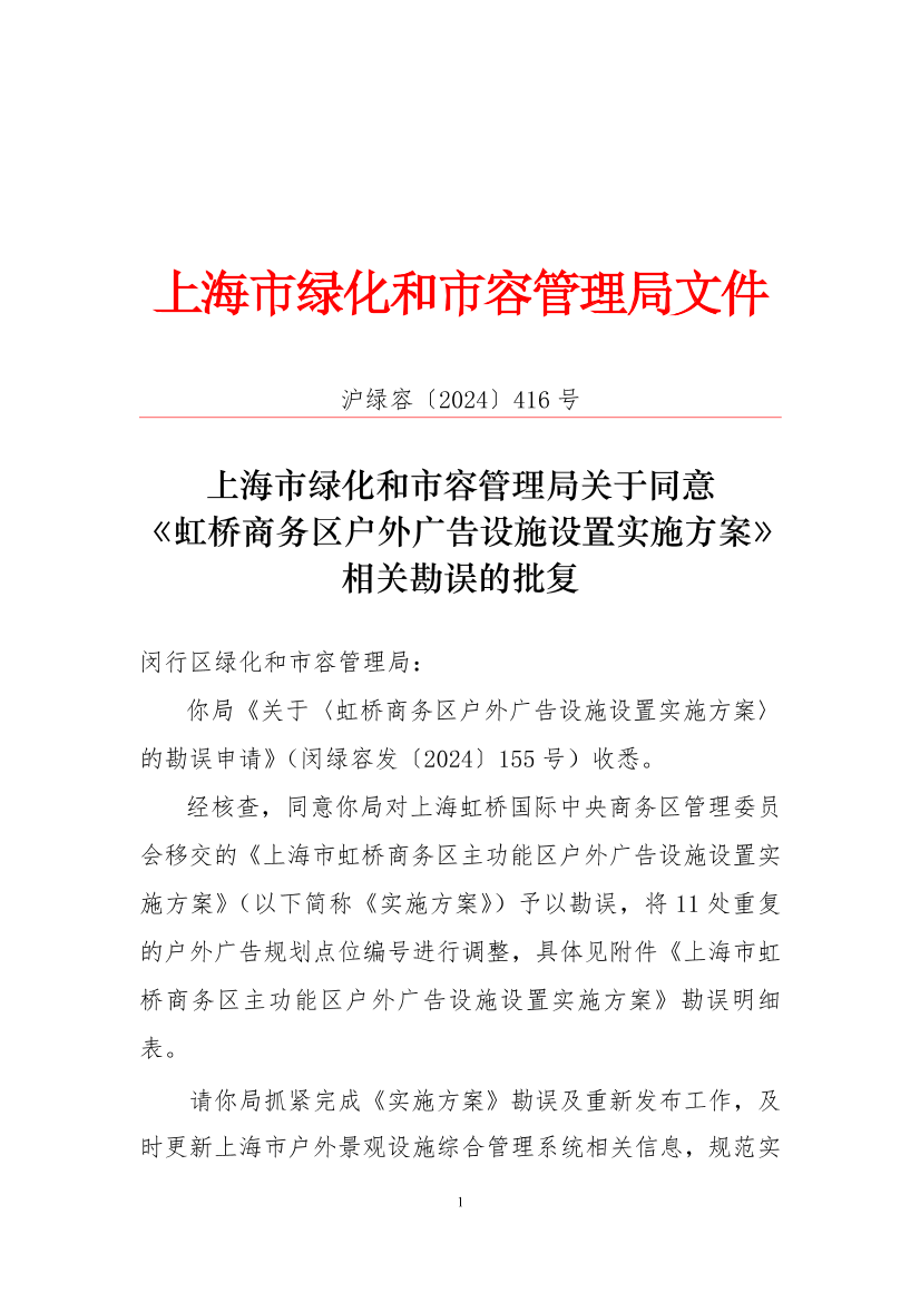 你局《关于〈虹桥商务区户外广告设施设置实施方案〉的勘误申请》(闵绿容发〔2024〕155号)收悉。