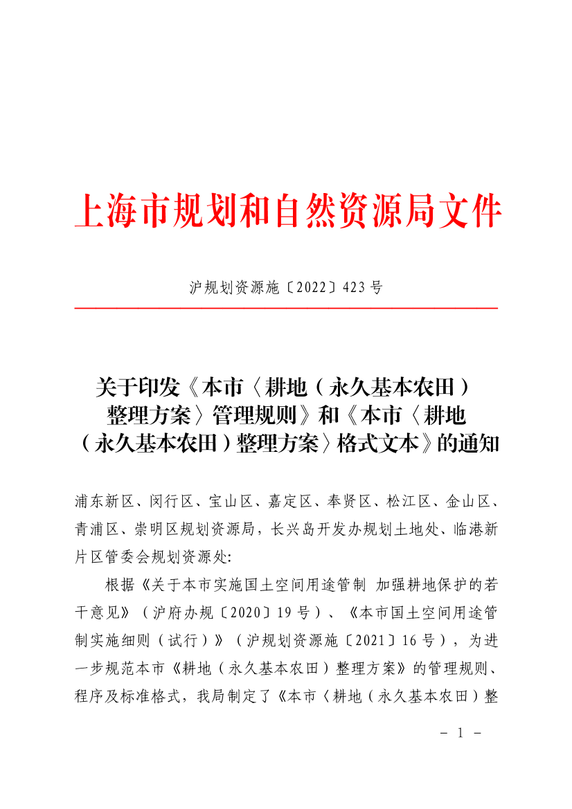 根据《关于本市实施国土空间用途管制 加强耕地保护的若干意见》(沪府办规〔2020〕19号)、《本市国土空间用途管制实施细则(试行)》(沪规划资源施〔2021〕16号),为进一步规范本市《耕地(永久基本农田)整理方案》的管理规则、程序及标准格式,我局制定了《本市〈耕地(永久基本农田)整理方案〉管理规则》和《本市〈耕地(永久基本农田)整理方案〉格式文本》。现予印发,请遵照执行。