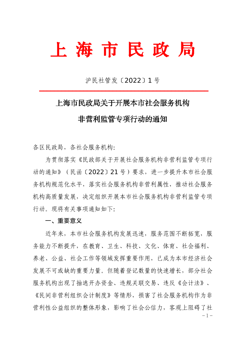 为贯彻落实《民政部关于开展社会服务机构非营利监管专项行动的通知》(民函〔2022〕21号)要求,进一步提升本市社会服务机构规范化水平,落实社会服务机构非营利属性,推动社会服务机构高质量发展,决定组织开展本市社会服务机构非营利监管专项行动。现将有关事项通知如下: