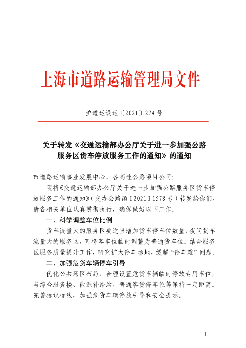 各单位应对照交通运输部办公厅文件要求推进和落实公路服务区货车停放服务工作,请市道路运输事业发展中心做好监督检查工作。