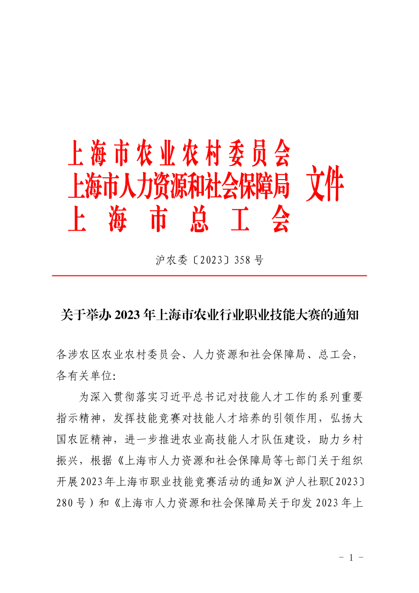 为深入贯彻落实习近平总书记对技能人才工作的系列重要指示精神,发挥技能竞赛对技能人才培养的引领作用,弘扬大国农匠精神,进一步推进农业高技能人才队伍建设,助力乡村振兴,根据《上海市人力资源和社会保障局等七部门关于组织开展2023年上海市职业技能竞赛活动的通知》(沪人社职〔2023〕280号)和《上海市人力资源和社会保障局关于印发2023年上海市行业性、区域性职业技能竞赛活动计划的通知》(沪人社职〔2023〕299号)文件要求,市农业农村委、市人力资源社会保障局、市总工会决定联合举办2023年上海市农业行业职业技能大赛。现将有关事项通知如下: