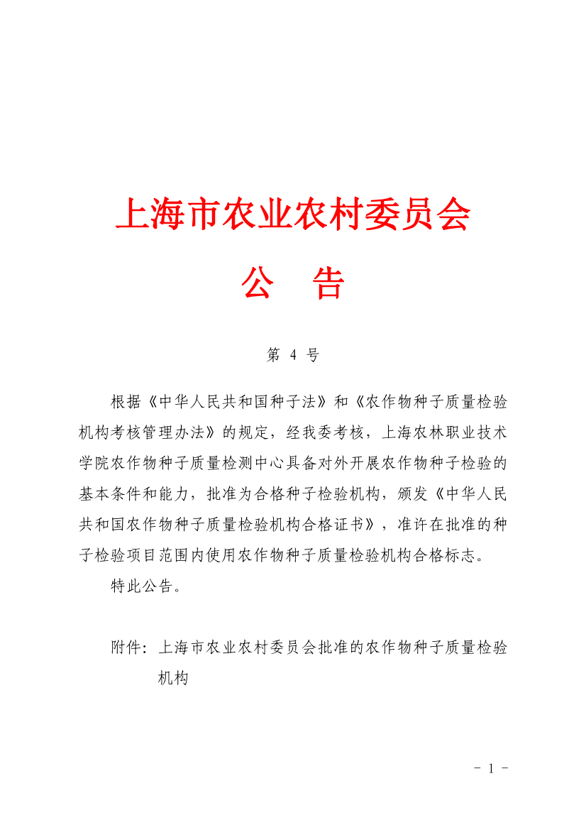 根据《中华人民共和国种子法》和《农作物种子质量检验机构考核管理办法》的规定,经我委考核,上海农林职业技术学院农作物种子质量检测中心具备对外开展农作物种子检验的基本条件和能力,批准为合格种子检验机构,颁发《中华人民共和国农作物种子质量检验机构合格证书》,准许在批准的种子检验项目范围内使用农作物种子质量检验机构合格标志。
