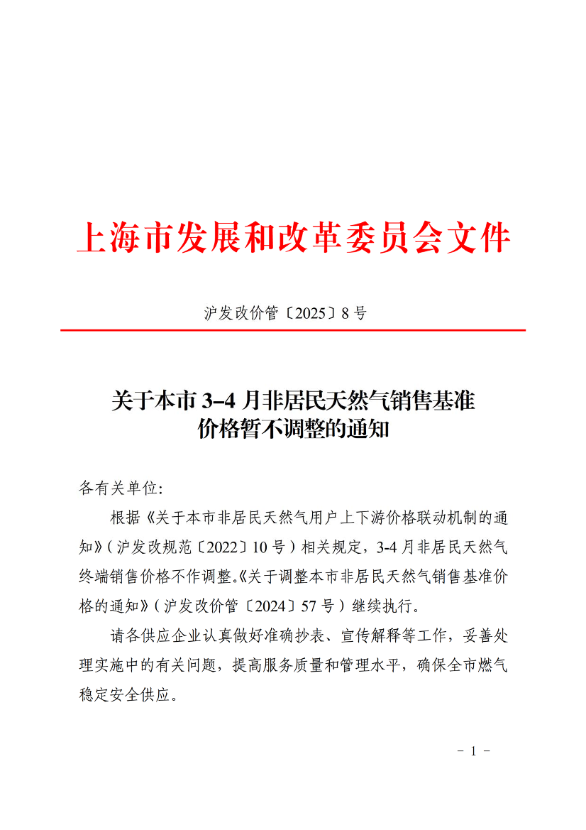 根据《关于本市非居民天然气用户上下游价格联动机制的通知》(沪发改规范〔2022〕10号)相关规定,3-4月非居民天然气终端销售价格不作调整。《关于调整本市非居民天然气销售基准价格的通知》(沪发改价管〔2024〕57号)继续执行。