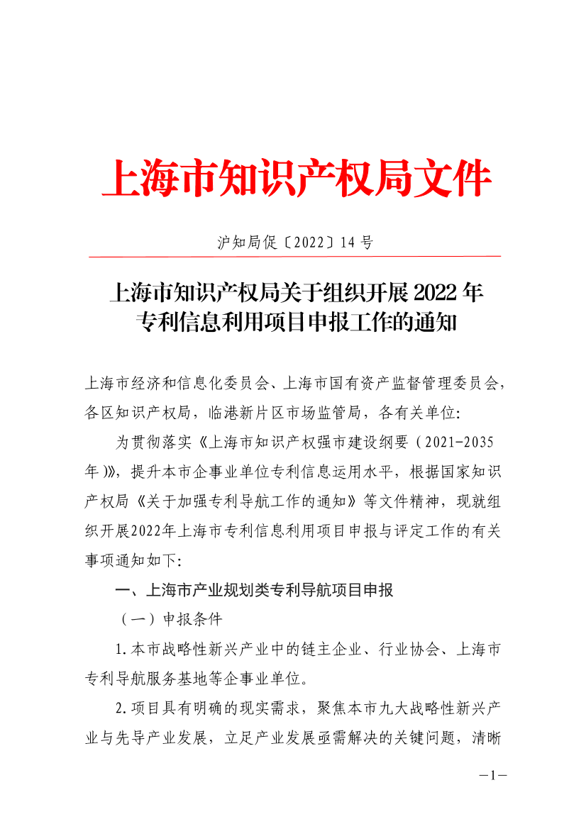 为贯彻落实《上海市知识产权强市建设纲要(2021-2035年)》,提升本市企事业单位专利信息运用水平,根据国家知识产权局《关于加强专利导航工作的通知》等文件精神,现就组织开展2022年上海市专利信息利用项目申报与评定工作的有关事项通知如下: