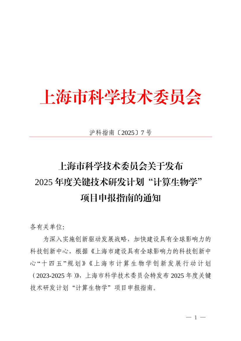 为深入实施创新驱动发展战略,加快建设具有全球影响力的科技创新中心,根据《上海市建设具有全球影响力的科技创新中心“十四五”规划》《上海市计算生物学创新发展行动计划(2023-2025年)》,上海市科学技术委员会特发布2025年度关键技术研发计划“计算生物学”项目申报指南。