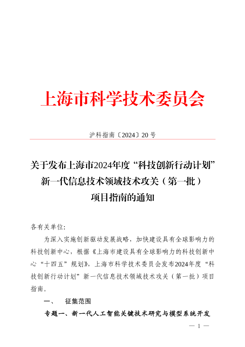 为深入实施创新驱动发展战略,加快建设具有全球影响力的科技创新中心,根据《上海市建设具有全球影响力的科技创新中心“十四五”规划》,上海市科学技术委员会发布2024年度“科技创新行动计划”新一代信息技术领域技术攻关(第一批)项目指南。