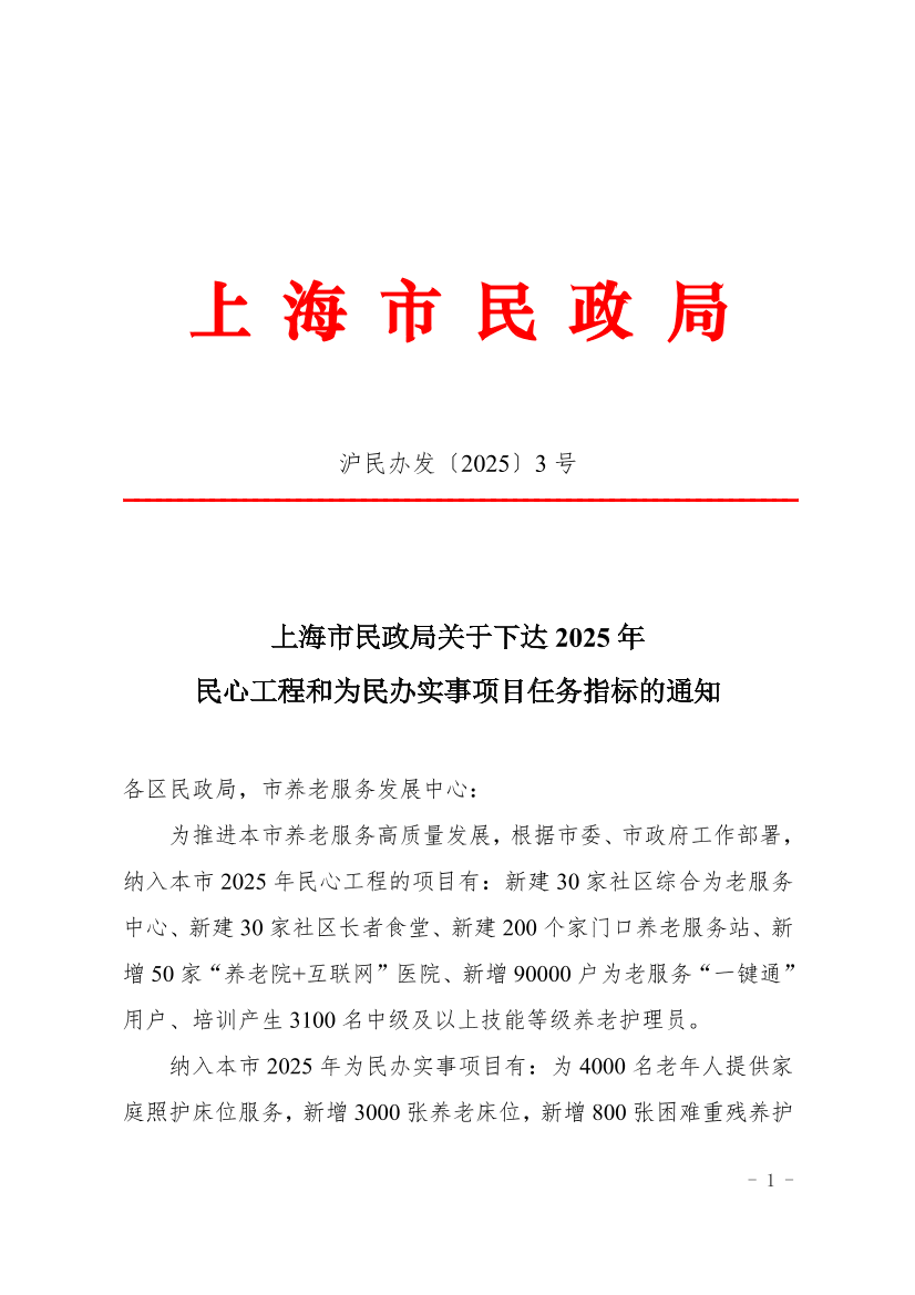 为推进本市养老服务高质量发展,根据市委、市政府工作部署,纳入本市2025年民心工程的项目有:新建30家社区综合为老服务中心、新建30家社区长者食堂、新建200个家门口养老服务站、新增50家“养老院+互联网”医院、新增90000户为老服务“一键通”用户、培训产生3100名中级及以上技能等级养老护理员。