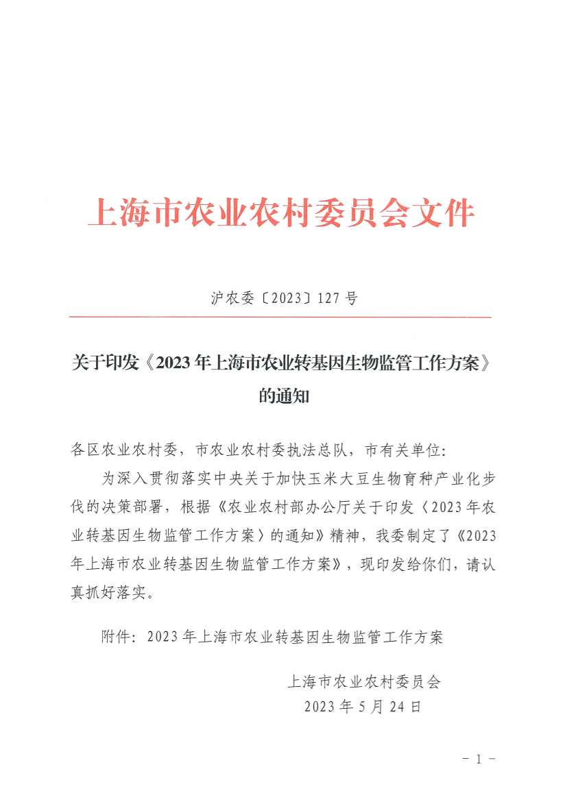 为深入贯彻落实中央关于加快玉米大豆生物育种产业化步伐的决策部署,根据《农业农村部办公厅关于印发〈2023年农业转基因生物监管工作方案〉的通知》精神,我委制定了《2023年上海市农业转基因生物监管工作方案》,现印发给你们,请认真抓好落实。