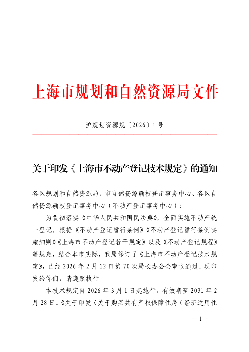 为贯彻落实《中华人民共和国民法典》,全面实施不动产统一登记,根据《不动产登记暂行条例》《不动产登记暂行条例实施细则》《上海市不动产登记若干规定》以及《不动产登记规程》等规定,结合本市实际,我局修订了《上海市不动产登记技术规定》,已经2026年2月12日第70次局长办公会审议通过。现印发给你们,请遵照执行。