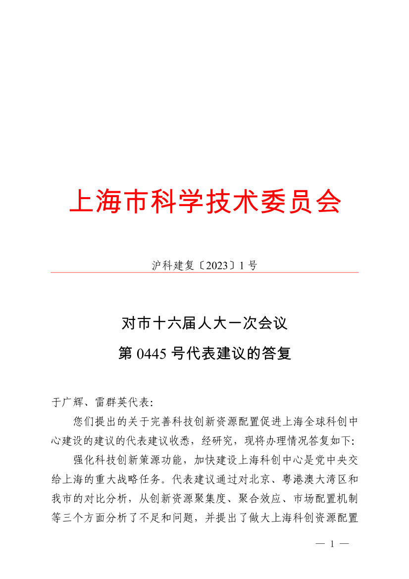 您们提出的关于完善科技创新资源配置促进上海全球科创中心建设的建议的代表建议收悉,经研究,现将办理情况答复如下: