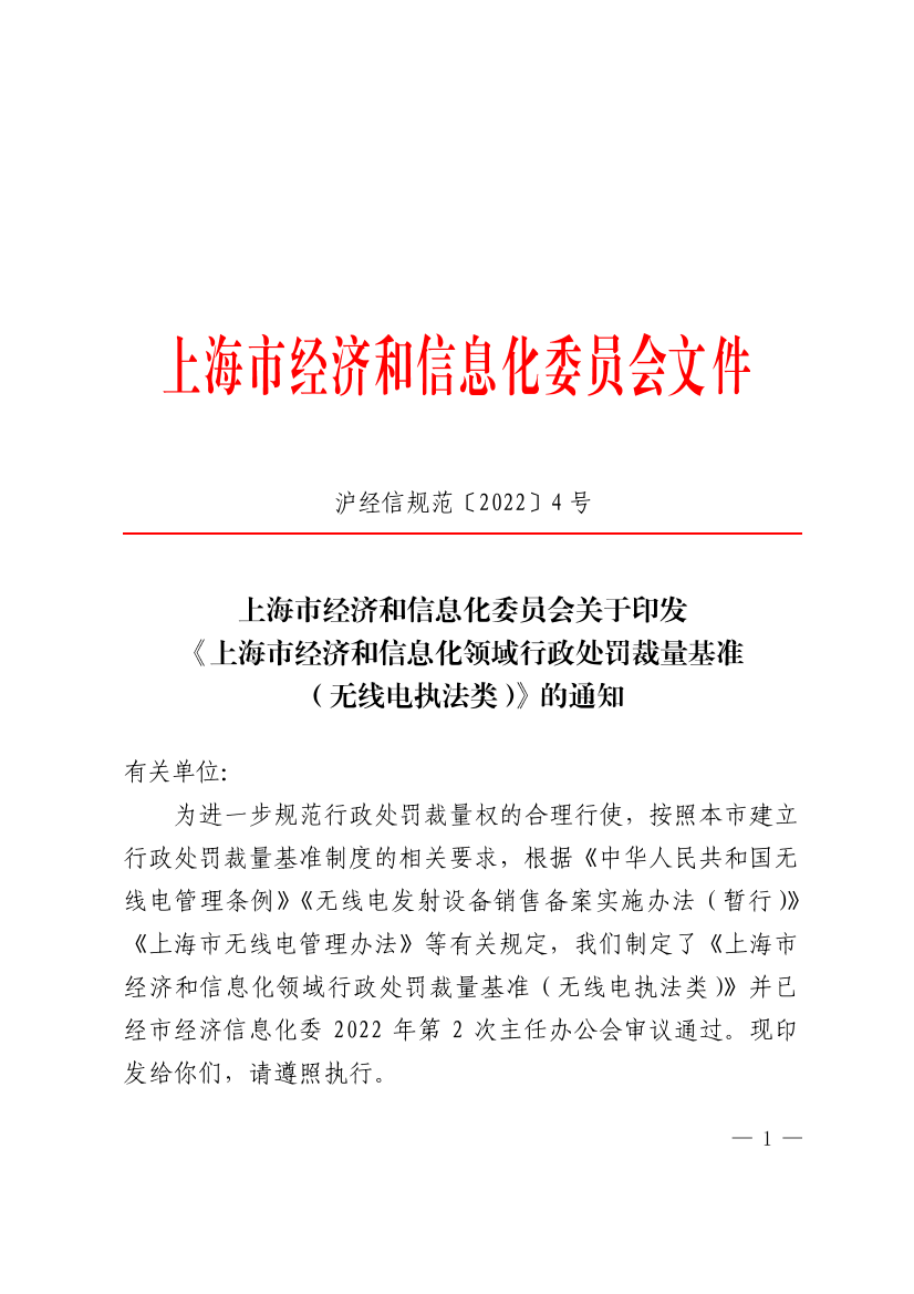 为进一步规范行政处罚裁量权的合理行使,按照本市建立行政处罚裁量基准制度的相关要求,根据《中华人民共和国无线电管理条例》《无线电发射设备销售备案实施办法(暂行)》《上海市无线电管理办法》等有关规定,我们制定了《上海市经济和信息化领域行政处罚裁量基准(无线电执法类)》并已经市经济信息化委2022年第2次主任办公会审议通过。现印发给你们,请遵照执行。