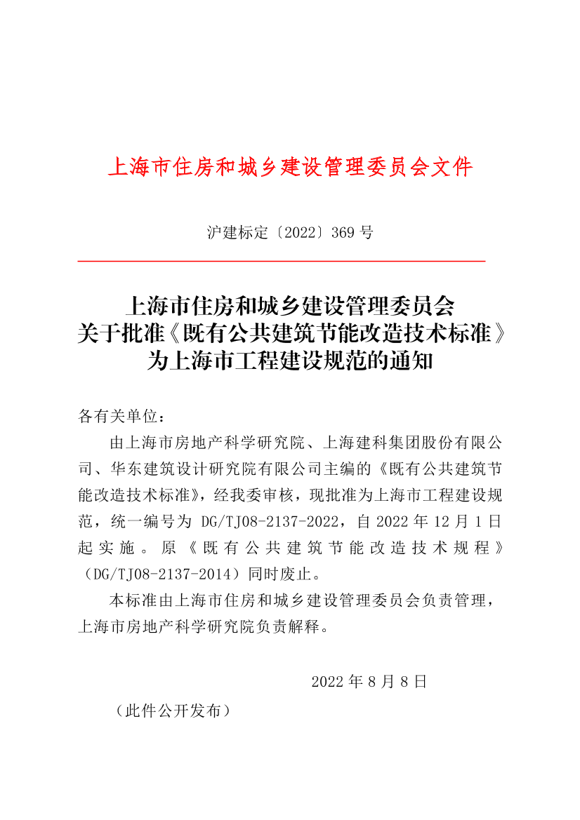 由上海市房地产科学研究院、上海建科集团股份有限公司、华东建筑设计研究院有限公司主编的《既有公共建筑节能改造技术标准》,经我委审核,现批准为上海市工程建设规范,统一编号为 DG/TJ08-2137-2022,自2022年12月1日起实施。原《既有公共建筑节能改造技术规程》(DG/TJ08-2137-2014)同时废止。