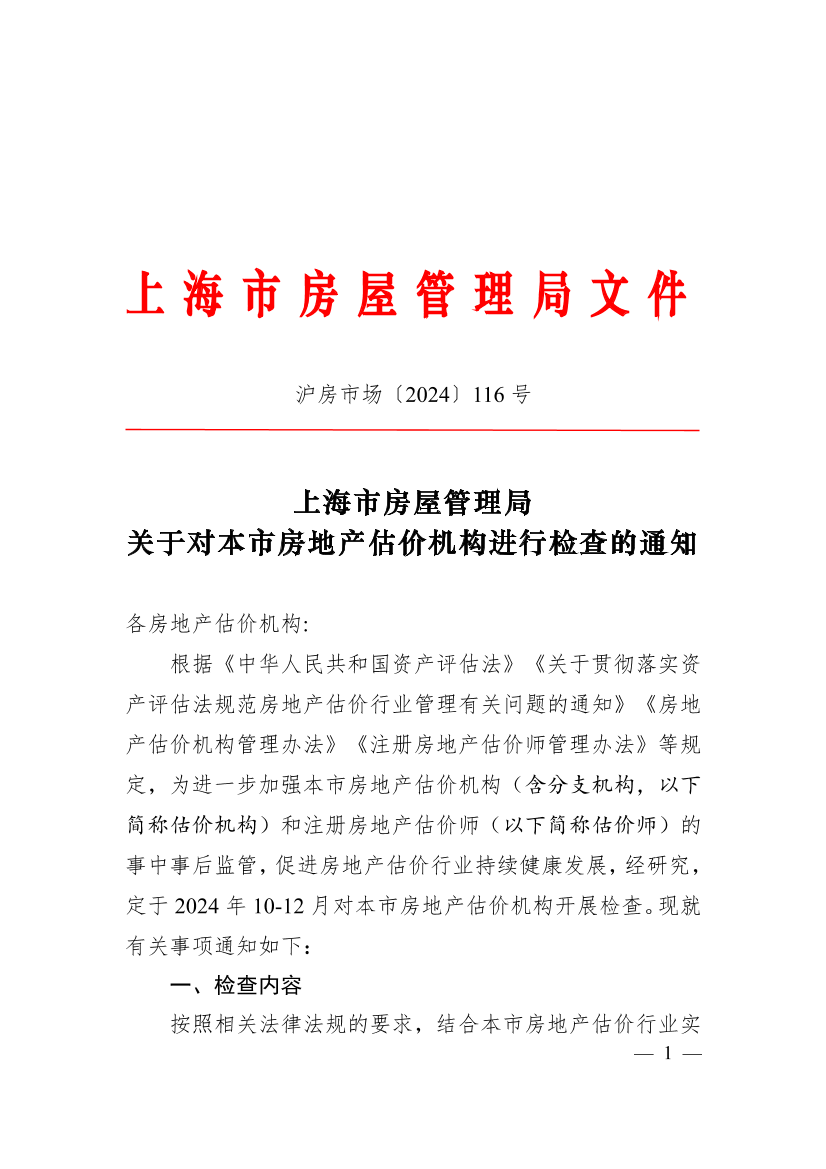 根据《中华人民共和国资产评估法》《关于贯彻落实资产评估法规范房地产估价行业管理有关问题的通知》《房地产估价机构管理办法》《注册房地产估价师管理办法》等规定,为进一步加强本市房地产估价机构(含分支机构,以下简称估价机构)和注册房地产估价师(以下简称估价师)的事中事后监管,促进房地产估价行业持续健康发展,经研究,定于2024年10-12月对本市房地产估价机构开展检查。现就有关事项通知如下: