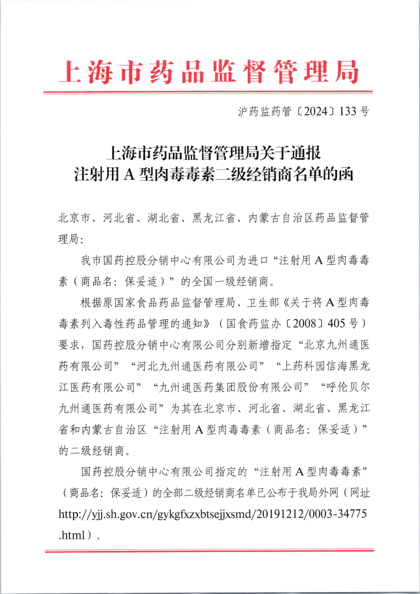 根据原国家食品药品监督管理局、卫生部《关于将A型肉毒毒素列入毒性药品管理的通知》(国食药监办〔2008〕405号)要求,国药控股分销中心有限公司分别新增指定“北京九州通医药有限公司”“河北九州通医药有限公司”“上药科园信海黑龙江医药有限公司”“九州通医药集团股份有限公司”“呼伦贝尔九州通医药有限公司”为其在北京市、河北省、湖北省、黑龙江省和内蒙古自治区“注射用A型肉毒毒素(商品名:保妥适)”的二级经销商。