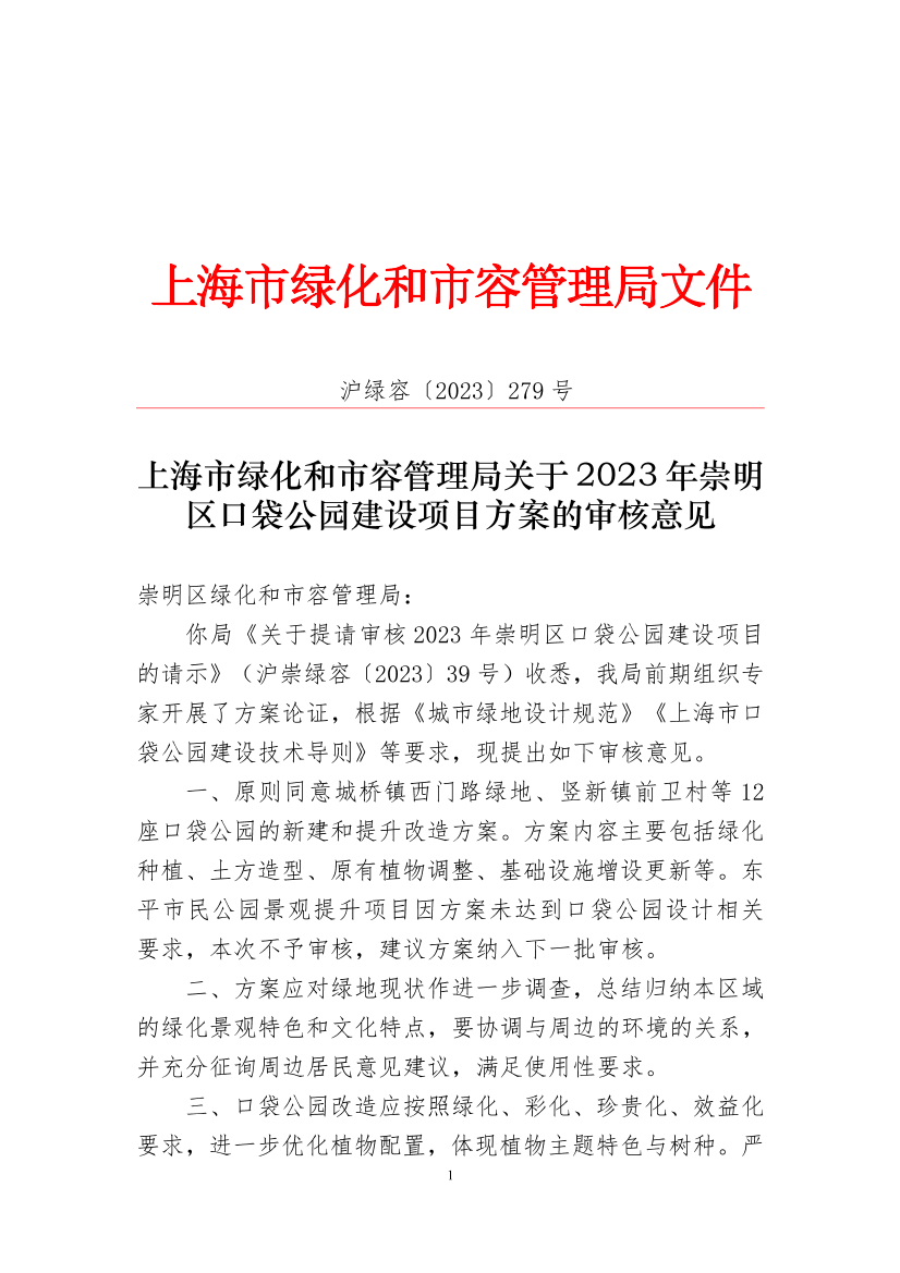 你局《关于提请审核2023年崇明区口袋公园建设项目的请示》(沪崇绿容〔2023〕39号)收悉,我局前期组织专家开展了方案论证,根据《城市绿地设计规范》《上海市口袋公园建设技术导则》等要求,现提出如下审核意见。