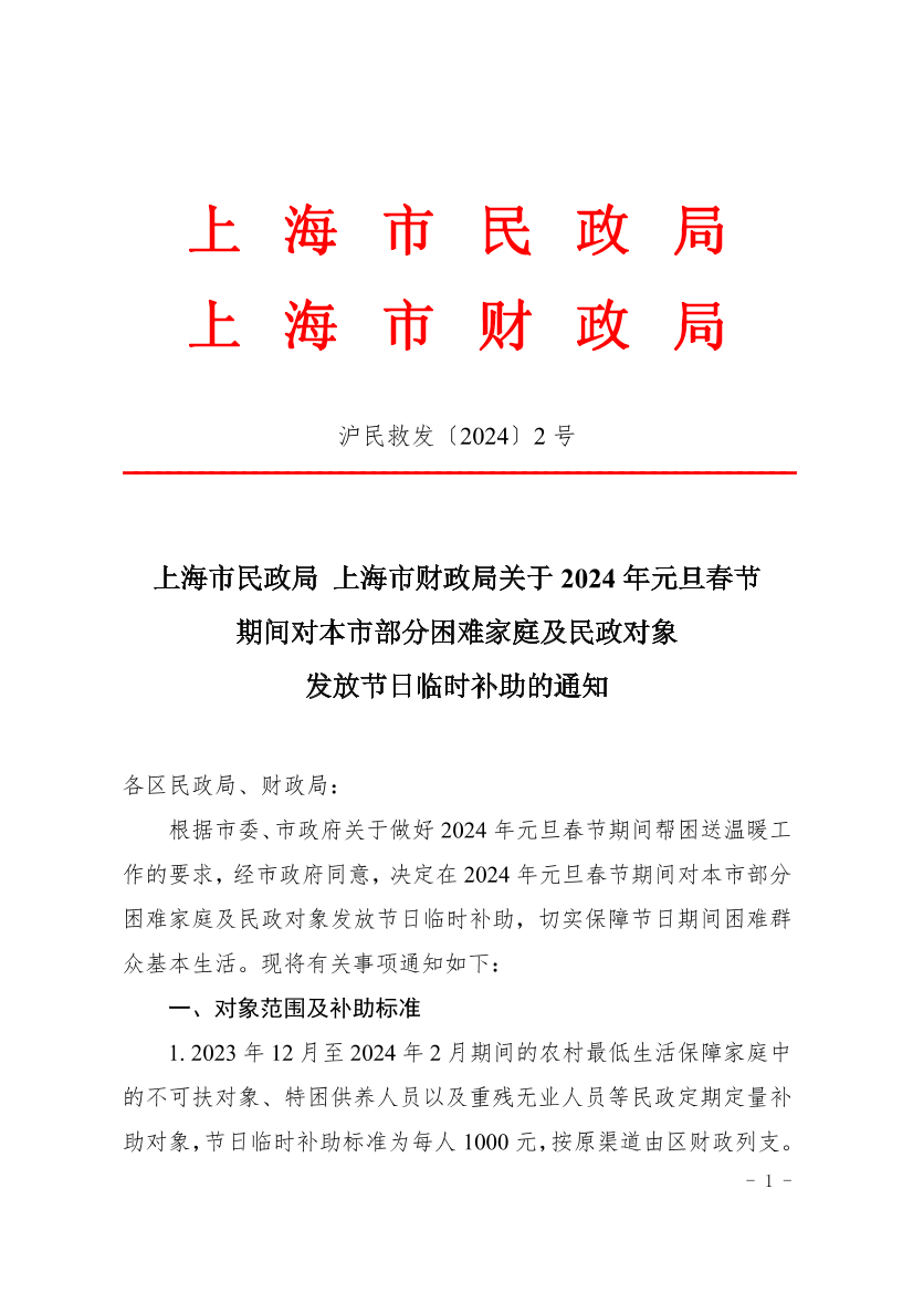1.2023年12月至2024年2月期间的农村最低生活保障家庭中的不可扶对象、特困供养人员以及重残无业人员等民政定期定量补助对象,节日临时补助标准为每人1000元,按原渠道由区财政列支。上述对象如同时符合市人力资源社会保障局或市退役军人局享受2024年元旦春节期间节日生活补助对象有关要求的,其补助标准就高享受,不得重复发放。