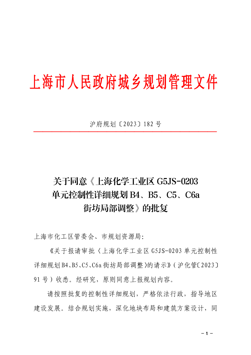 《关于报请审批〈上海化学工业区G5JS-0203单元控制性详细规划B4、B5、C5、C6a街坊局部调整〉的请示》(沪化管〔2023〕91号)收悉。经研究,原则同意上报规划内容。