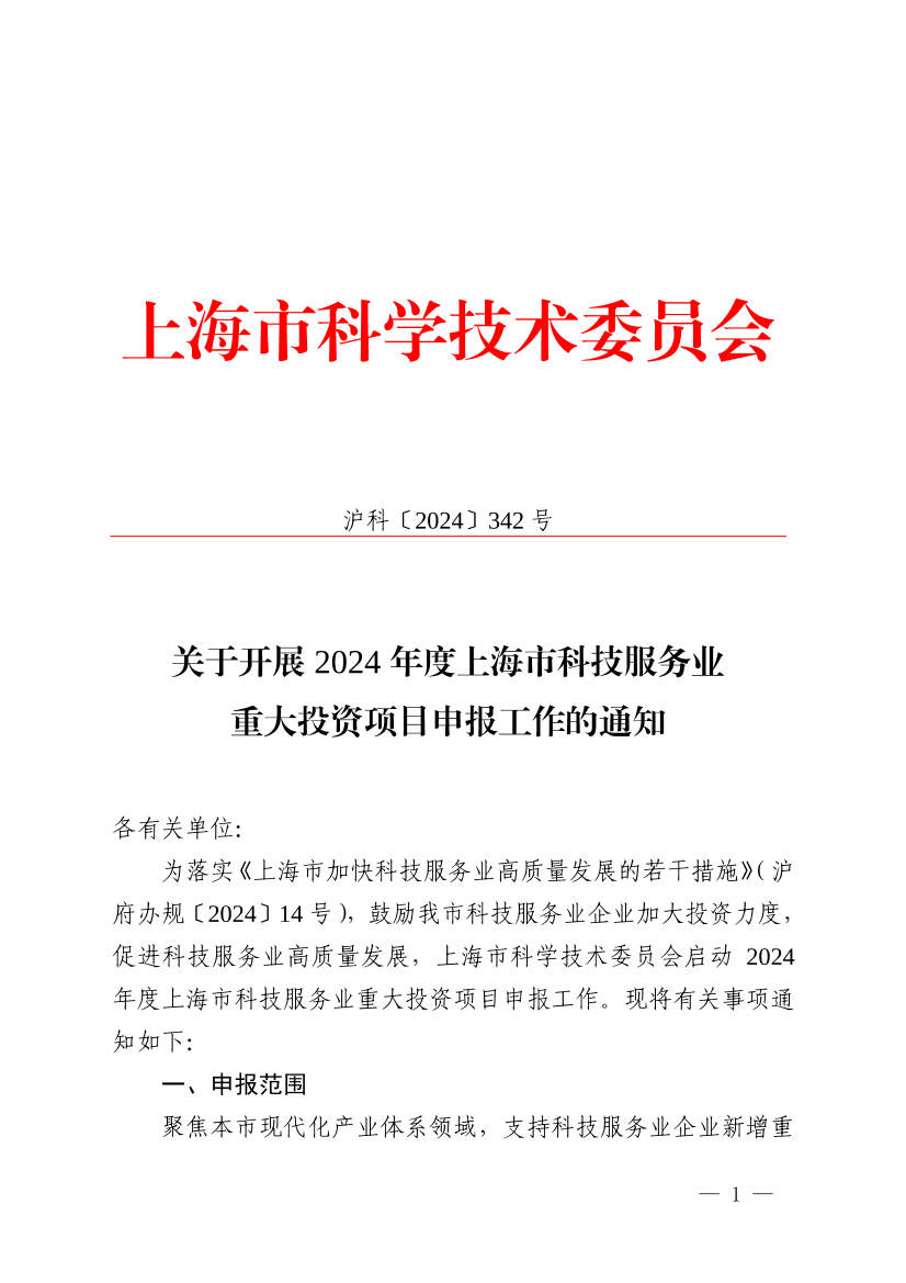 为落实《上海市加快科技服务业高质量发展的若干措施》(沪府办规〔2024〕14号),鼓励我市科技服务业企业加大投资力度,促进科技服务业高质量发展,上海市科学技术委员会启动2024年度上海市科技服务业重大投资项目申报工作。现将有关事项通知如下:
