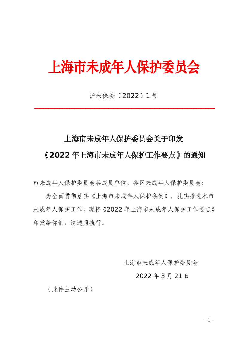 为全面贯彻落实《上海市未成年人保护条例》,扎实推进本市未成年人保护工作,现将《2022年上海市未成年人保护工作要点》印发给你们,请遵照执行。