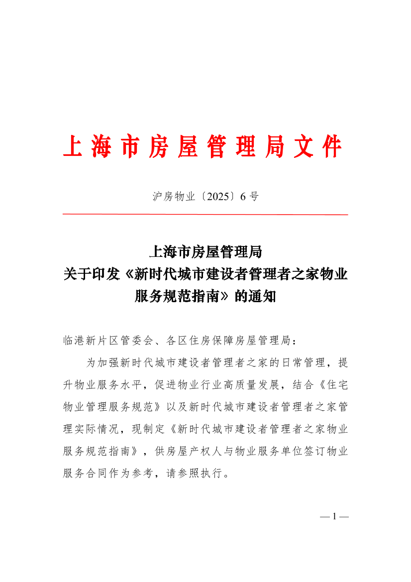 为加强新时代城市建设者管理者之家的日常管理,提升物业服务水平,促进物业行业高质量发展,结合《住宅物业管理服务规范》以及新时代城市建设者管理者之家管理实际情况,现制定《新时代城市建设者管理者之家物业服务规范指南》,供房屋产权人与物业服务单位签订物业服务合同作为参考,请参照执行。