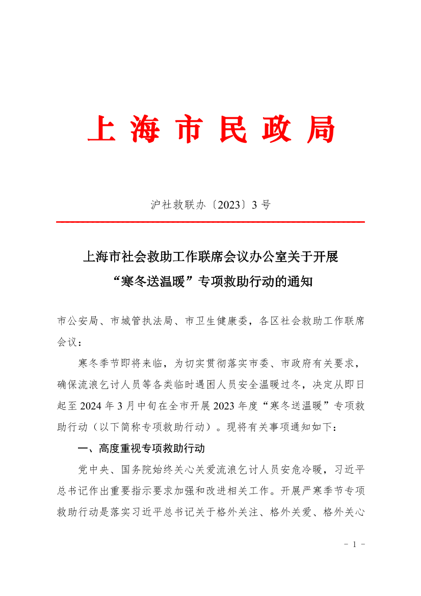 寒冬季节即将来临,为切实贯彻落实市委、市政府有关要求,确保流浪乞讨人员等各类临时遇困人员安全温暖过冬,决定从即日起至2024年3月中旬在全市开展2023年度“寒冬送温暖”专项救助行动(以下简称专项救助行动)。现将有关事项通知如下: