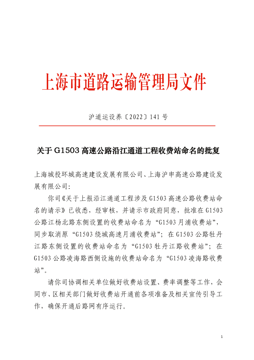 你司《关于上报沿江通道工程涉及G1503高速公路收费站命名的请示》已收悉,经审核,并请示市政府同意,批准在G1503公路江杨北路东侧设置的收费站命名为“G1503月浦收费站”,同步取消原“G1503绕城高速月浦收费站”;在G1503公路牡丹江路东侧设置的收费站命名为“G1503牡丹江路收费站”;在G1503公路凌海路西侧设施的收费站命名为“G1503凌海路收费站”。