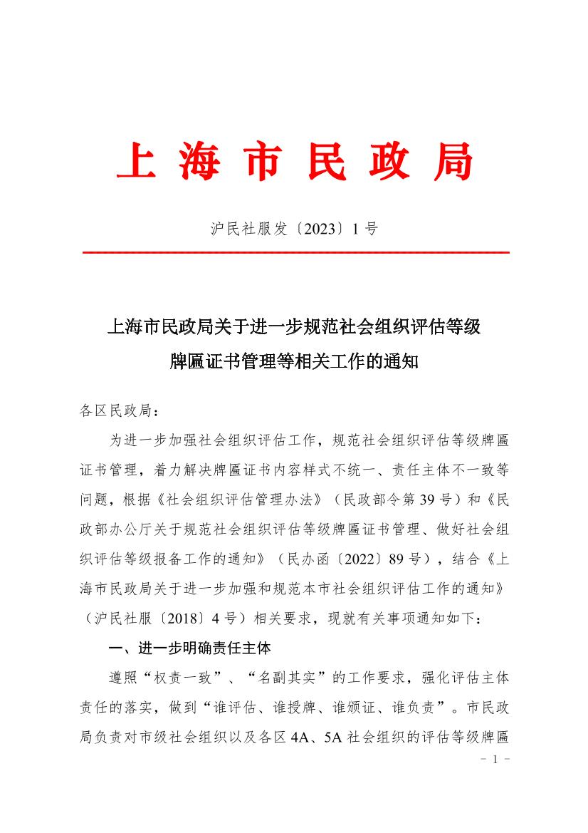 为进一步加强社会组织评估工作,规范社会组织评估等级牌匾证书管理,着力解决牌匾证书内容样式不统一、责任主体不一致等问题,根据《社会组织评估管理办法》(民政部令第39号)和《民政部办公厅关于规范社会组织评估等级牌匾证书管理、做好社会组织评估等级报备工作的通知》(民办函〔2022〕89号),结合《上海市民政局关于进一步加强和规范本市社会组织评估工作的通知》(沪民社服〔2018〕4号)相关要求,现就有关事项通知如下:
