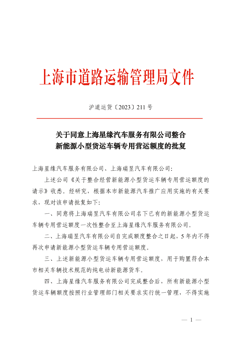 一、同意将上海瑞昱汽车有限公司名下已有的新能源小型货运车辆专用营运额度一次性整合至上海星缘汽车服务有限公司。