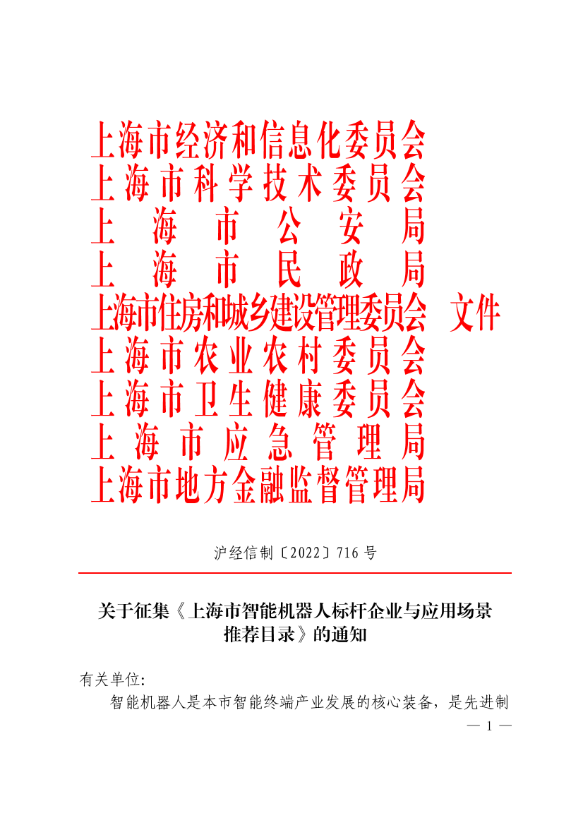 智能机器人是本市智能终端产业发展的核心装备,是先进制造与新一代信息技术融合的前沿方向。根据工业和信息化部、科学技术部、公安部、民政部、住房和城乡建设部、农业农村部、国家卫生健康委员会、应急管理部等十五部委《关于印发“十四五”机器人产业发展规划的通知》(工信部联规〔2021〕206号)与上海市人民政府《上海市促进智能终端产业高质量发展行动方案(2022-2025年)》(沪府办发〔2022〕12号),为推动本市智能机器人产业高质量发展,强化智能机器人终端带动、赋能百业的应用优势,现面向本市征集《上海市智能机器人标杆企业与应用场景推荐目录》(以下简称《推荐目录》),具体通知如下。