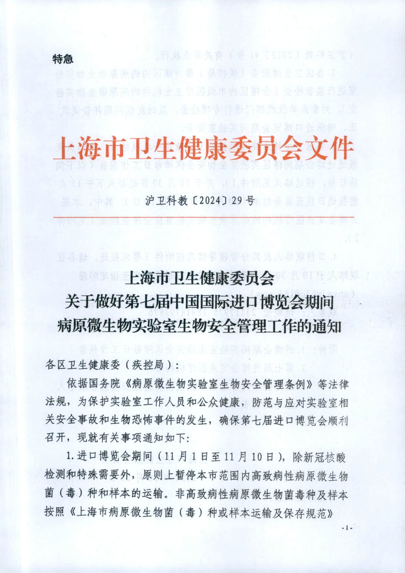 1.进口博览会期间(11月1日至11月10日),除新冠核酸检测和特殊需要外,原则上暂停本市范围内高致病性病原微生物菌(毒)种和样本的运输。非高致病性病原微生物菌毒种及样本按照《上海市病原微生物菌(毒)种或样本运输及保存规范》(沪卫科教〔2012〕41号)有关要求执行。