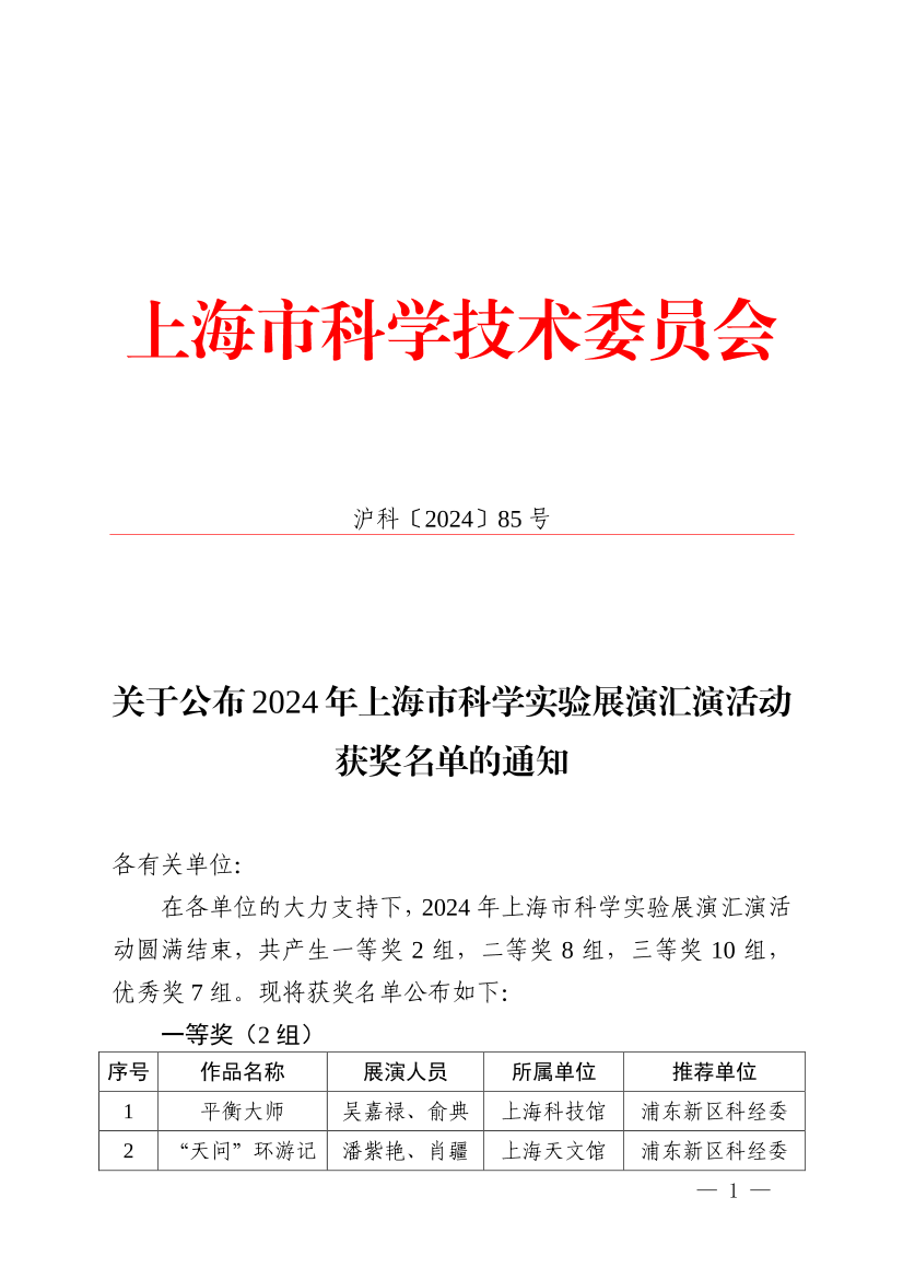 在各单位的大力支持下,2024年上海市科学实验展演汇演活动圆满结束,共产生一等奖2组,二等奖8组,三等奖10组,优秀奖7组。现将获奖名单公布如下: