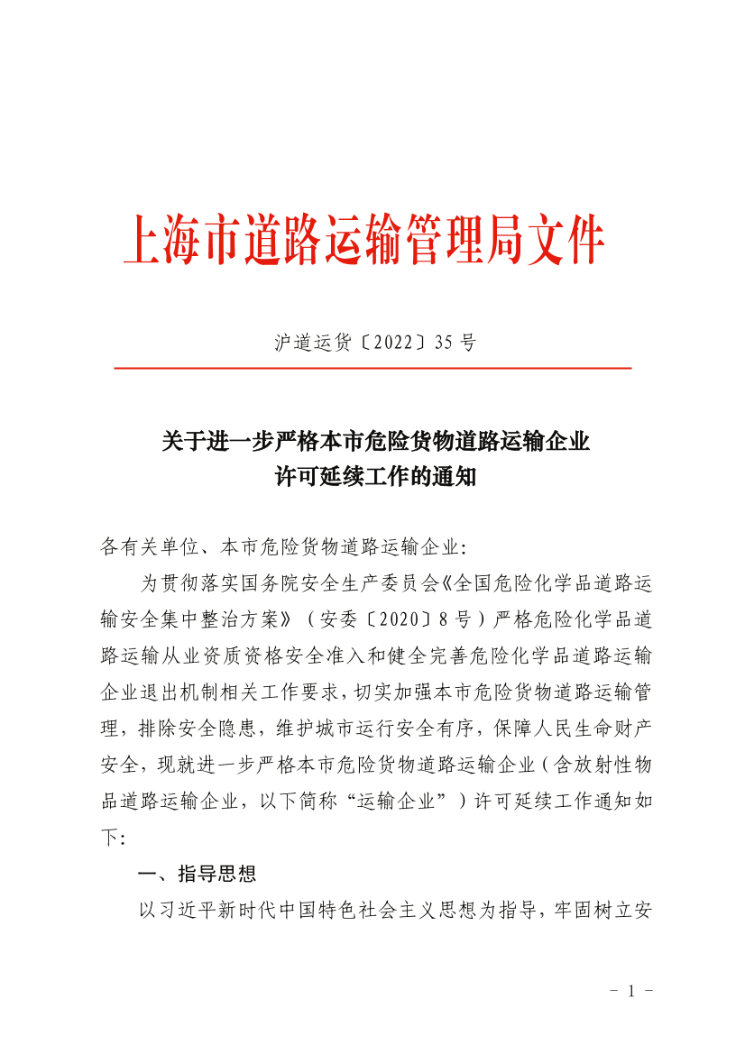 为贯彻落实国务院安全生产委员会《全国危险化学品道路运输安全集中整治方案》(安委〔2020〕8号)严格危险化学品道路运输从业资质资格安全准入和健全完善危险化学品道路运输企业退出机制相关工作要求,切实加强本市危险货物道路运输管理,排除安全隐患,维护城市运行安全有序,保障人民生命财产安全,现就进一步严格本市危险货物道路运输企业(含放射性物品道路运输企业,以下简称“运输企业”)许可延续工作通知如下: