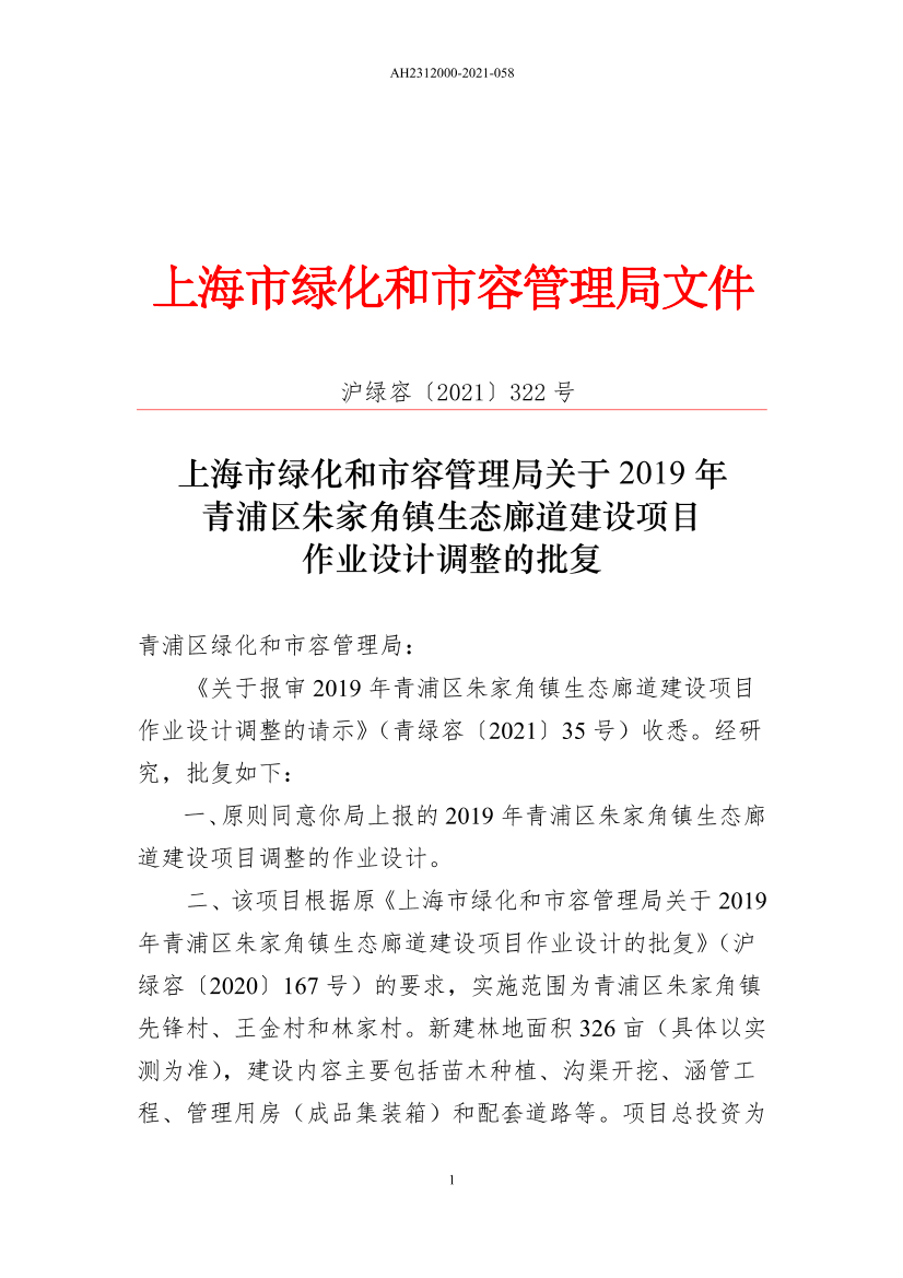 《关于报审2019年青浦区朱家角镇生态廊道建设项目作业设计调整的请示》(青绿容〔2021〕35号)收悉。经研究,批复如下: