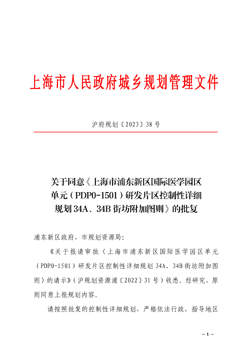 《关于报请审批〈上海市浦东新区国际医学园区单元(PDP0-1501)研发片区控制性详细规划34A、34B街坊附加图则〉的请示》(沪规划资源浦〔2022〕31号)收悉。经研究,原则同意上报规划内容。