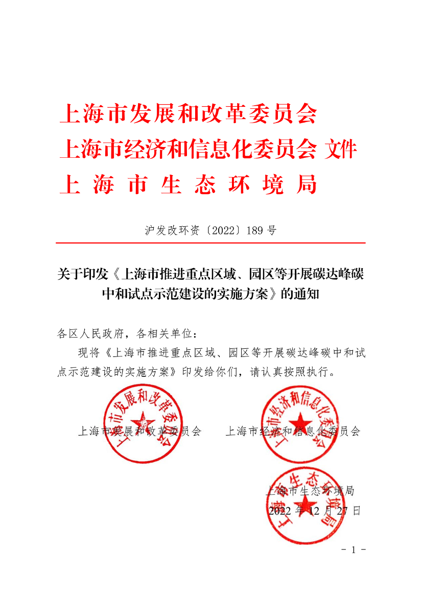 上海市推进重点区域、园区等开展碳达峰碳中和试点示范建设的实施方案