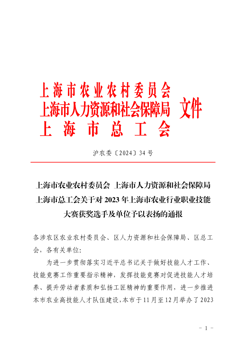 为进一步贯彻落实习近平总书记关于做好技能人才工作、技能竞赛工作重要指示精神,发挥技能竞赛对促进技能人才培养、提升劳动者素质和弘扬工匠精神的重要作用,进一步推进本市农业高技能人才队伍建设,本市于11月至12月举办了2023年上海市农业行业职业技能大赛(以下简称“农业行业技能大赛”)。根据《上海市农业农村委员会、上海市人力资源和社会保障局、上海市总工会关于举办2023年上海市农业行业职业技能大赛的通知》(沪农委〔2023〕358号)的相关要求,现决定对“农业行业技能大赛”的获奖选手及单位予以通报表扬。具体如下:
