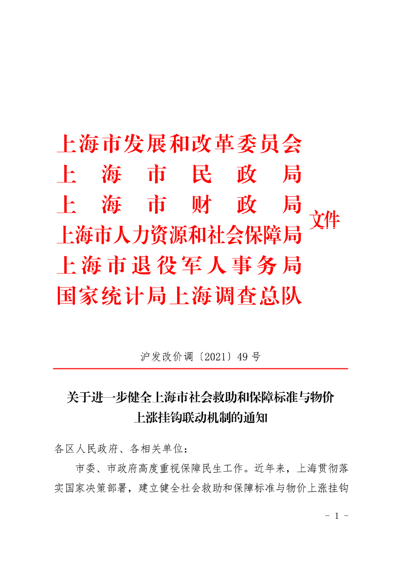 市委、市政府高度重视保障民生工作。近年来,上海贯彻落实国家决策部署,建立健全社会救助和保障标准与物价上涨挂钩的联动机制,及时足额发放价格临时补贴,对于缓解物价上涨对困难群众基本生活的影响发挥了重要作用。根据国家发展改革委等六部委印发的《关于进一步健全社会救助和保障标准与物价上涨挂钩联动机制的通知》(发改价格〔2021〕1553号)要求,为切实做好困难群众基本生活保障工作,现就进一步健全价格补贴联动机制有关事项通知如下: