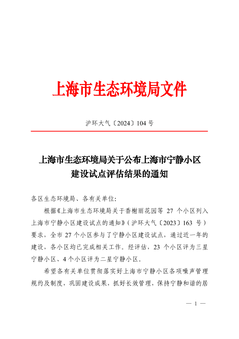 根据《上海市生态环境局关于香榭丽花园等 27 个小区列入上海市宁静小区建设试点的通知》(沪环大气〔2023〕163号)要求,全市27个小区参与了宁静小区建设试点,通过近一年的建设,各小区均已完成相关工作。经评估,23个小区评为三星宁静小区、4个小区评为二星宁静小区。