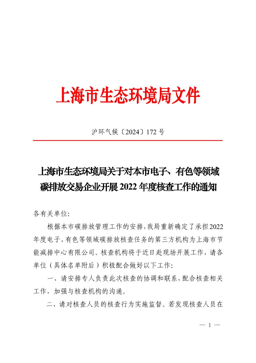 根据本市碳排放管理工作的安排,我局重新确定了承担2022年度电子、有色等领域碳排放核查任务的第三方机构为上海市节能减排中心有限公司。核查机构将于近日赴现场开展工作,请各单位(具体名单附后)积极配合做好以下工作: