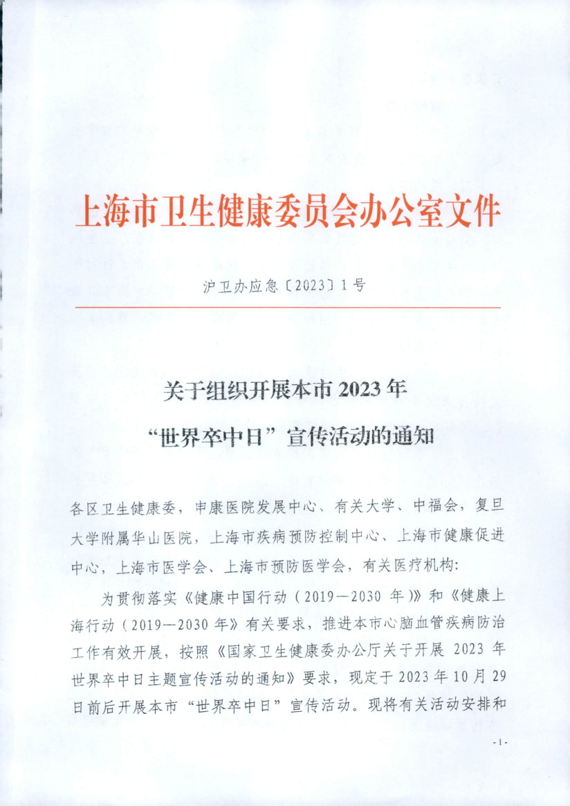 为贯彻落实《健康中国行动(2019—2030年)》和《健康上海行动(2019—2030年》有关要求,推进本市心脑血管疾病防治工作有效开展,按照《国家卫生健康委办公厅关于开展2023年世界卒中日主题宣传活动的通知》要求,现定于2023年10月29日前后开展本市“世界卒中日”宣传活动。现将有关活动安排和具体要求通知如下: