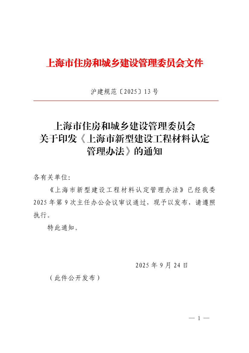 《上海市新型建设工程材料认定管理办法》已经我委2025年第9次主任办公会议审议通过,现予以发布,请遵照执行。