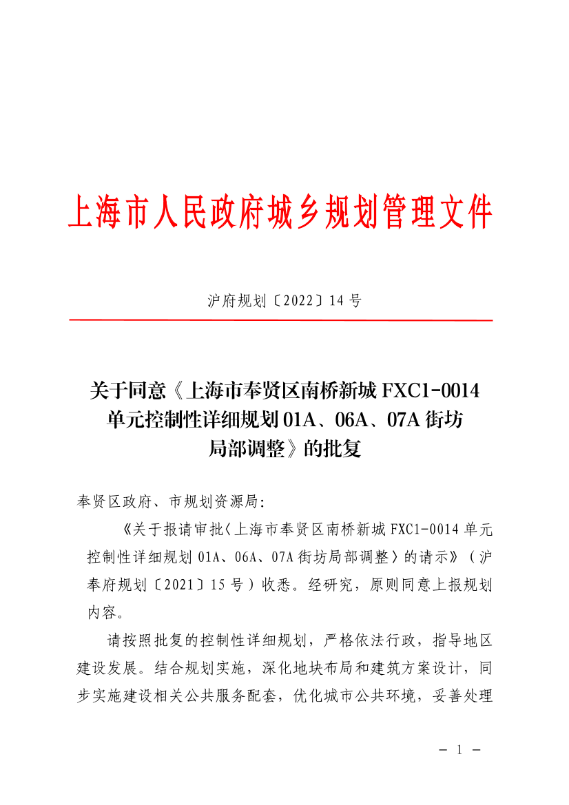 《关于报请审批〈上海市奉贤区南桥新城FXC1-0014单元控制性详细规划01A、06A、07A街坊局部调整〉的请示》(沪奉府规划〔2021〕15号)收悉。经研究,原则同意上报规划内容。